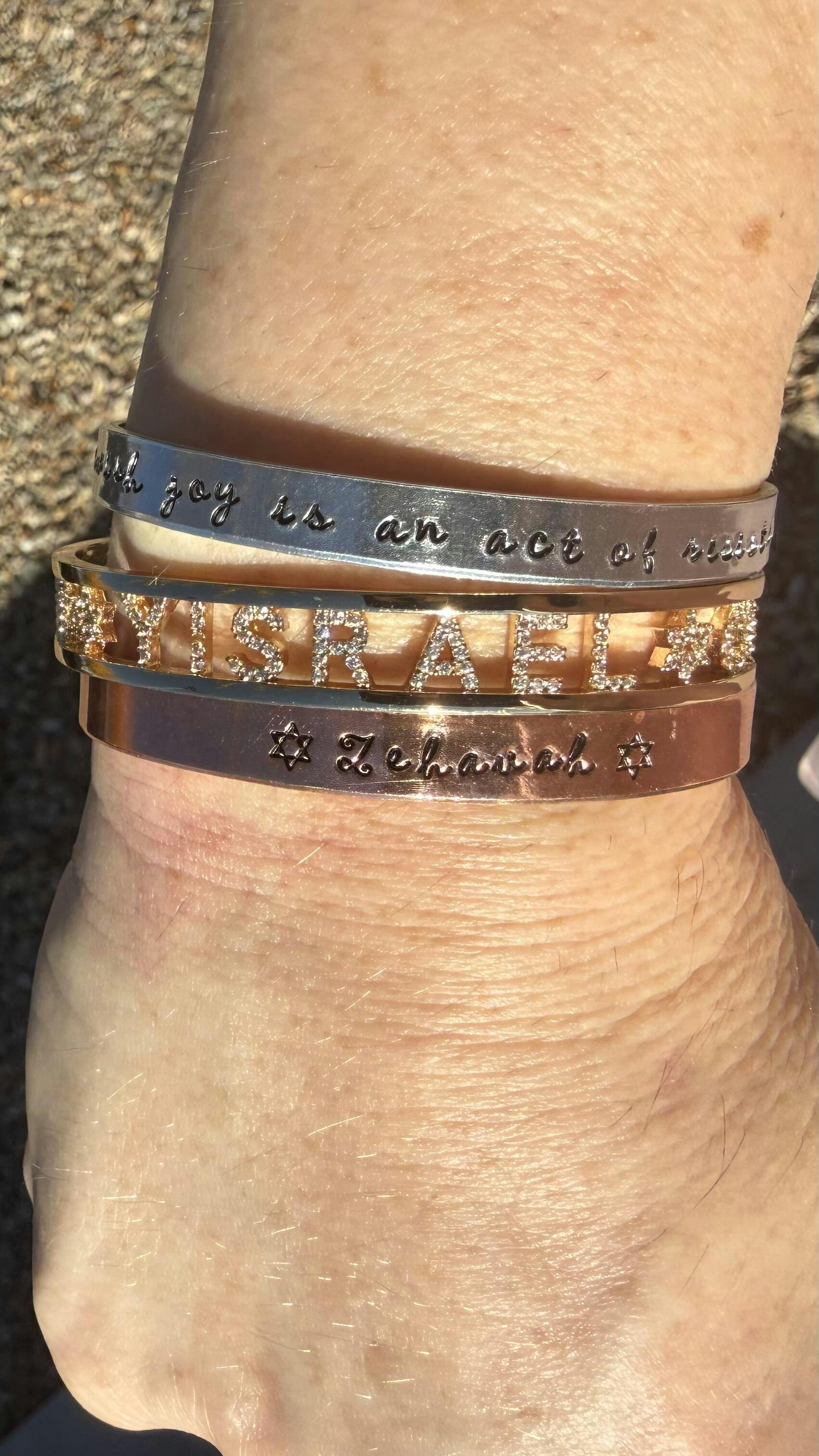Each cuff is hand-stamped in my Rockaway Beach studio — a mix of Hebrew and English phrases celebrating modern Jewish identity.