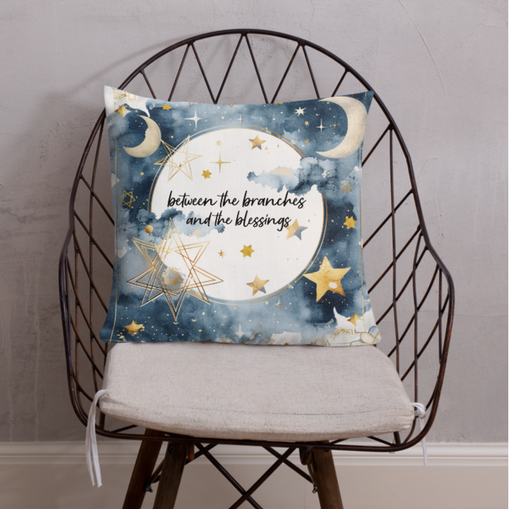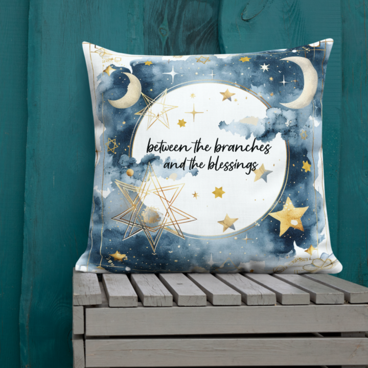 Celebrate Sukkot in celestial style with this Between the Branches and the Blessings throw pillow. Printed in rich blues and golds, it’s the perfect accent for your sukkah seating — adding both beauty and comfort for the full eight days. Available in two sizes, each pillow comes with a plush insert so it’s ready to enjoy right away.