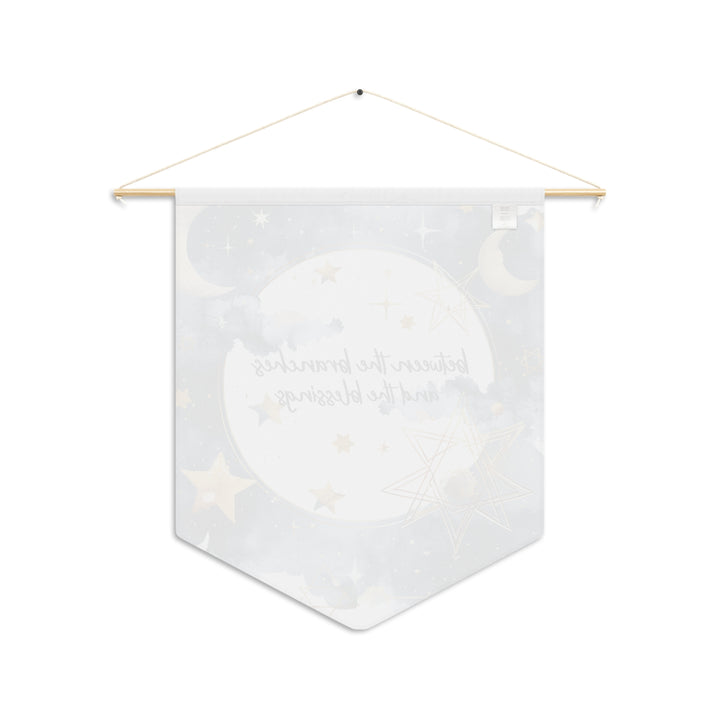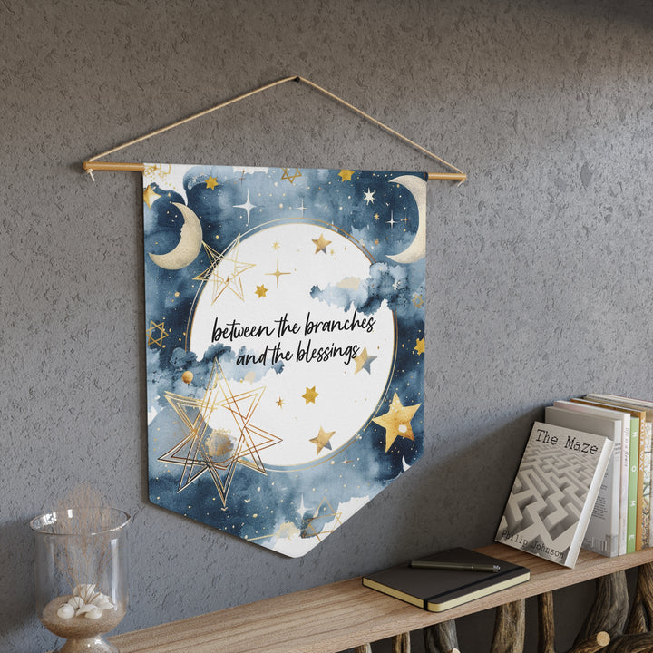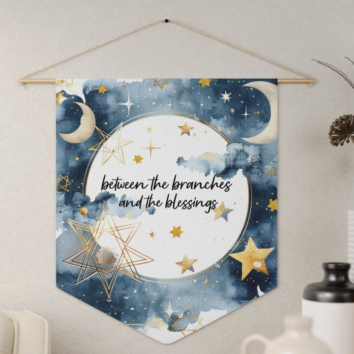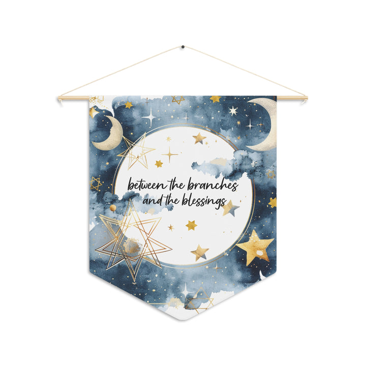 Bring a touch of night sky magic to your sukkah with this celestial wall pennant featuring the phrase Between the Branches and the Blessings.