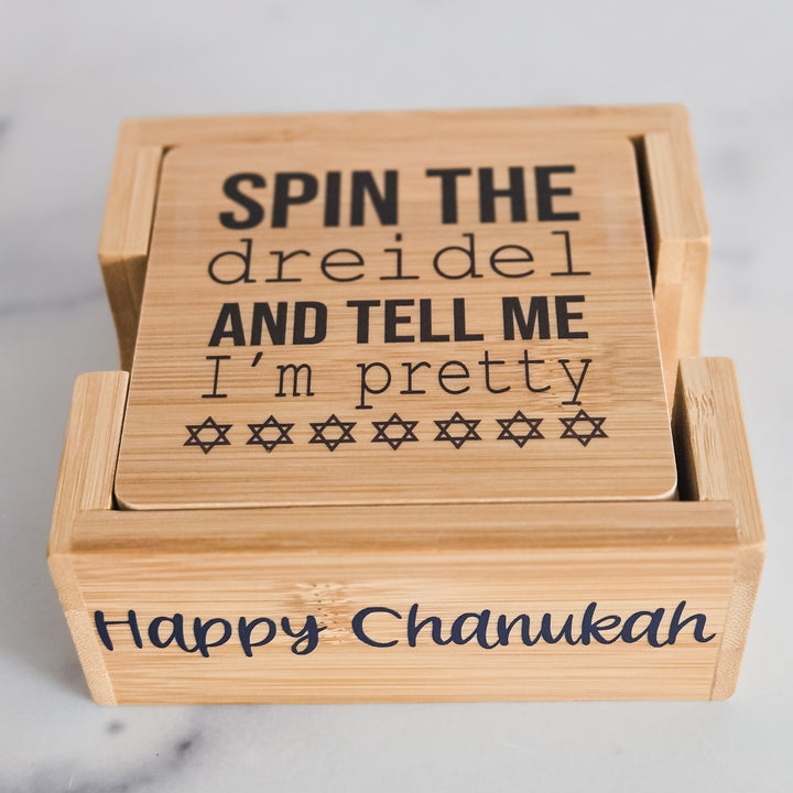 This modern bamboo coaster set features four designs from our “Tell Me I’m Pretty” Hanukkah series: